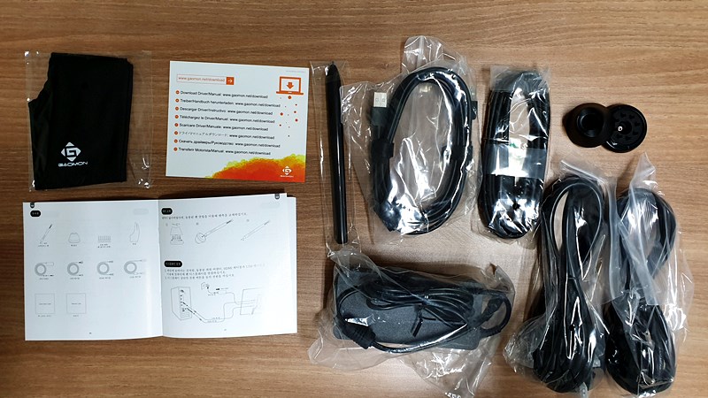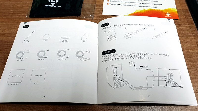 장갑. 퀵가이드. 펜. USB케이블. HDMI케이블. 펜홀더.