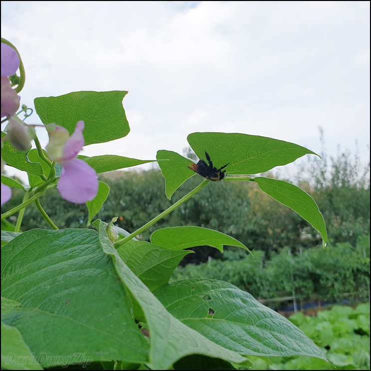 날개에 빗방울을 달고 콩잎 밑에서 쉬고 있던 녀석이.